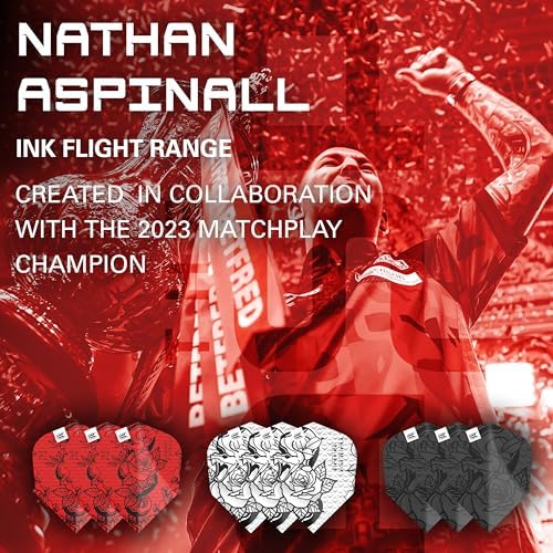Target Darts, in collaboration with the 2023 Matchplay Champion, Nathan “The Asp” Aspinall, presents an impressive set of 3 flight packs, showcasing a unique hand-drawn tattoo design to elevate your game. This multipack comprises a total of 9 flights, available in three impactful colourways, ensuring the perfect choice for your game and exceptional value. These high-quality flights feature the striking tattoo design on highly durable 100-micron material, offered in No.2, No.6, and Ten-X sizes. They effortlessly fit any shafts available in the market. This pack includes 9 flights, combining style and performance to enhance your darts experience, endorsed by a champion player.